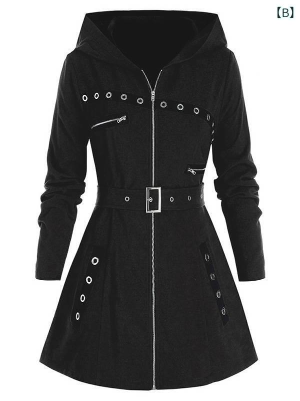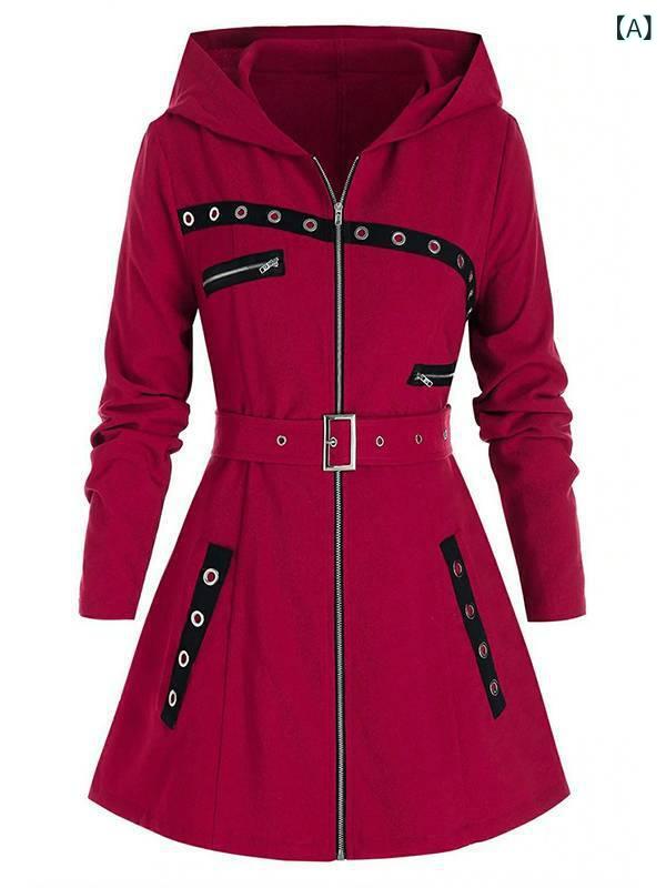コート レディース 秋冬 長袖 連帽 アウター 膝丈 ミドル丈 コットン 赤 黒 伸縮性