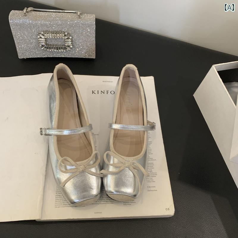 バレエシューズ レディース 瑪麗珍鞋 シルバー シルバー ローヒール ストラップ 蝶結び スクエアトゥ かわいい 歩きやすい 普段使い 旅行