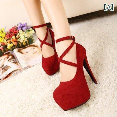 高跟パンプス レディース ベルベット調 クロスストラップ ポインテッドトゥ ピンヒール ハイヒール 厚底 黒 赤 青 春夏 パーティー ドレス キャバ
