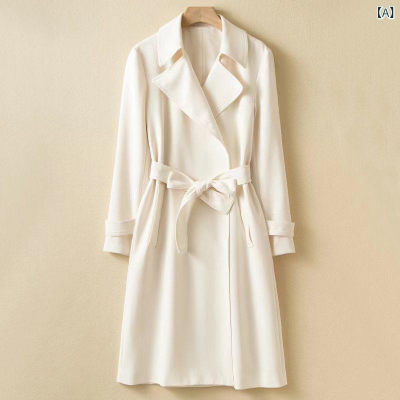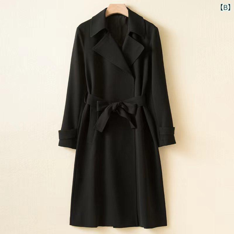 コート レディース 混紡 翻領 長袖 ロング丈 ウエストベルト付き ゆったり 無地 通勤 ミディアム厚 米白 黒 棠紫色