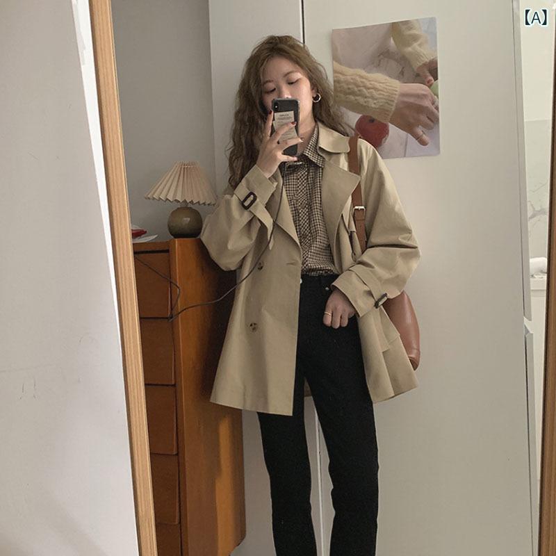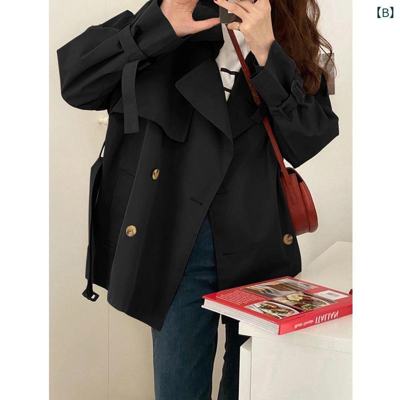 トレンチコート レディース ショート丈 春秋 韓国 ポリエステル 無地 襟付き 長袖 カジュアル ゆったり カーキ ブラック・素材: ポリエステル繊維.スパンデックス・柄: 無地・厚さ: 中・フィット: ストレート・着丈: 短め(40cm超~50cm以下)・ネックライン: 襟付き・袖丈: 長袖・デザイン: 拼接・カラー: カーキ.ブラック・サイズ: S.M.L.XL.XXL・スタイル: 日韓カジュアル.カジュアル・袖のタイプ: レギュラー袖・フロント: ダブルブレスト・対象年齢: 大人・対象性別: 女性・主素材の含有量: 30%以下