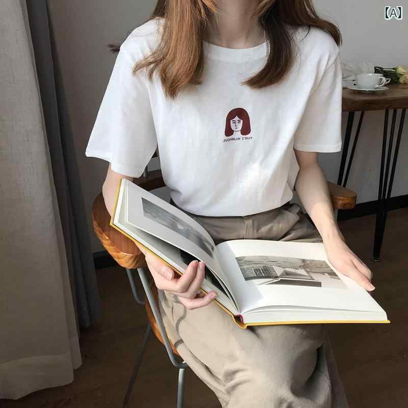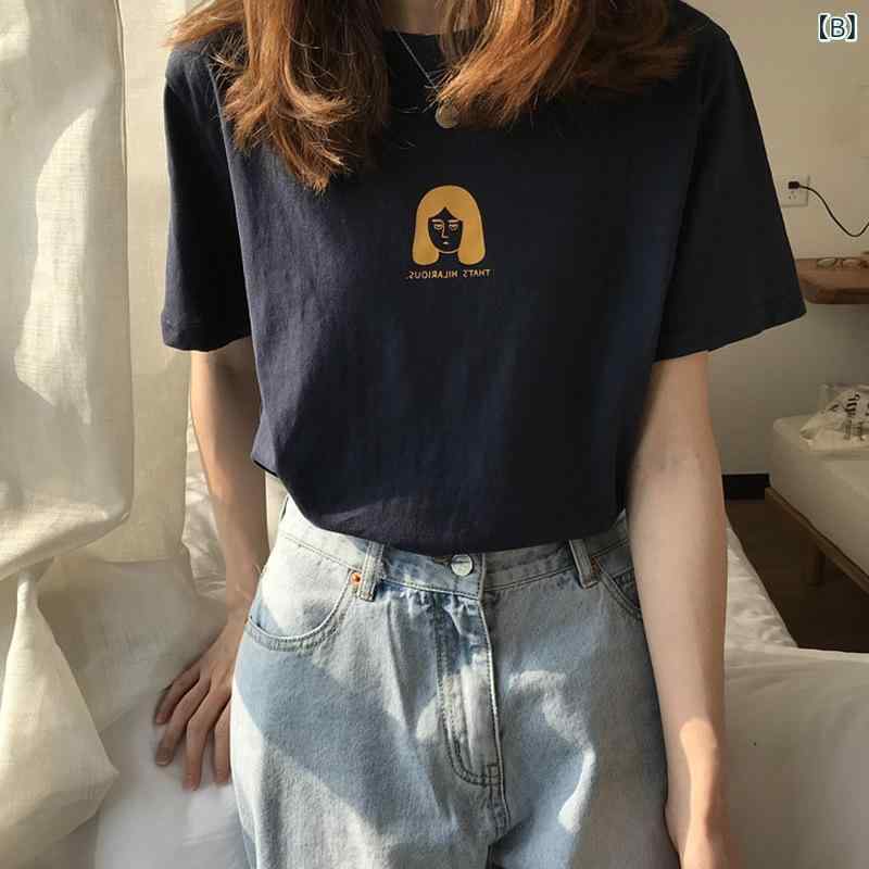 Tシャツ レディース 半袖 ゆったり 韓国風 トップス カットソー ポリエステル プリント ホワイト 紺色 M L XL 2XL 通勤 通学 普段使い[ {"instruction": "次のテキストに以下を適用してください。