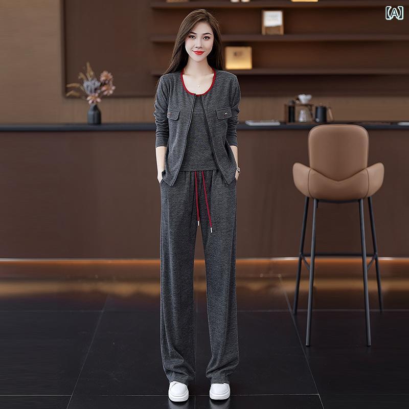 ジャージ レディース 3点セット 春秋 部屋着 上下セットアップ 長袖 パーカー ワイドパンツ ポリエステル 無地 韓国風 カジュアル スタイル・图案: 纯色・裤长: 长裤・流行元素: 纽扣・面料名称: 涤纶・主面料成分: 涤纶(聚酯纤维)・主面料成分2: 氨纶・颜色: 深灰色(三件套)・尺码: M, L, XL, 2XL・风格类型: 日韩休闲・主面料成分含量: 70%(含)-80%(不含)・风格: 休闲风・套装款式: 裤套装・适用性别: 女・袖型: 常规袖・袖长: 长袖・产品类别: 休闲套装・主面料成分2含量: 30%以下