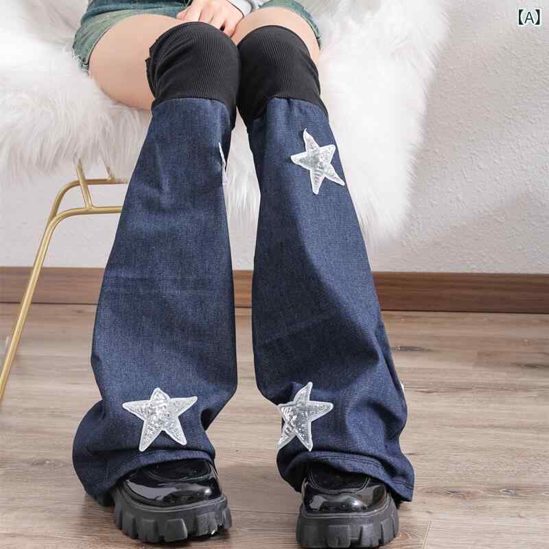 レッグウォーマー レディース デニム 星柄 Y2K ギャル 薄手 コットン ニーハイソックス ブーツカット ブルー