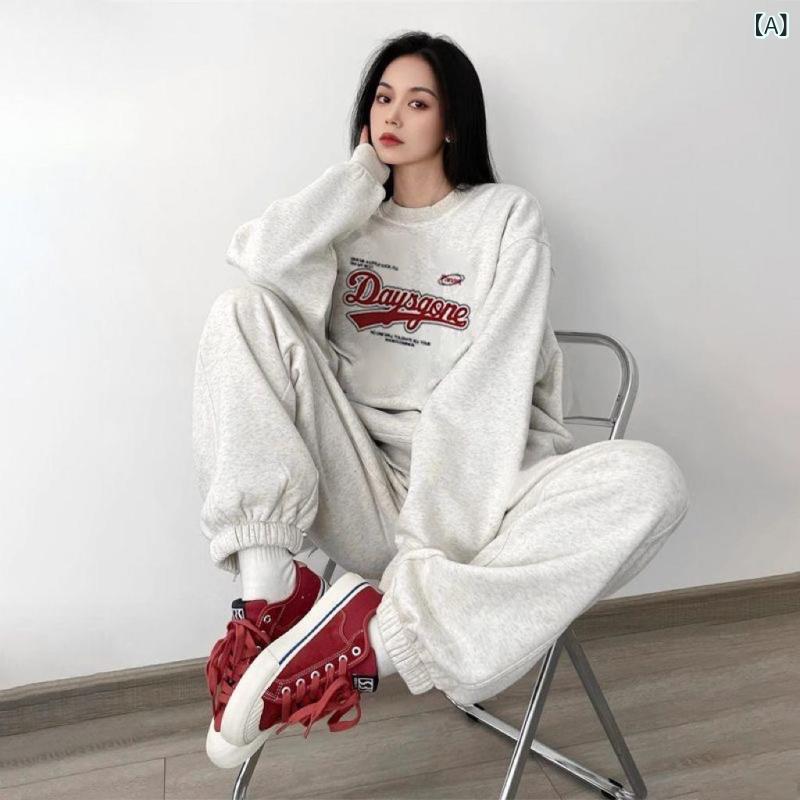 セットアップ レディース 秋冬 レトロ スウェット 白グレー M L XL XXL 綿 ルームウェア 部屋着 リラックスウェア