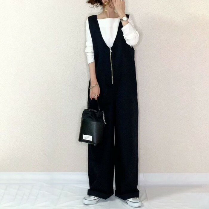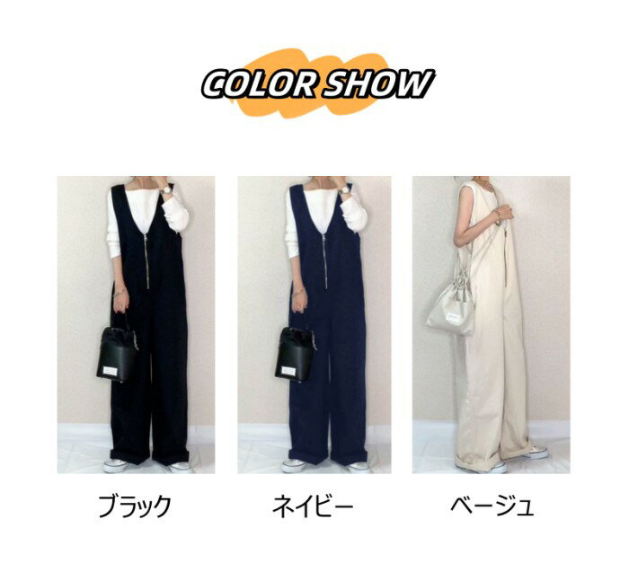 サロペット レディース フロントジップ ワイドシルエット Vネック オールインワン 夏服 ノースリーブ シンプル カジュアル 体型カバー フロントジップ ワイドシルエットサロペット 5