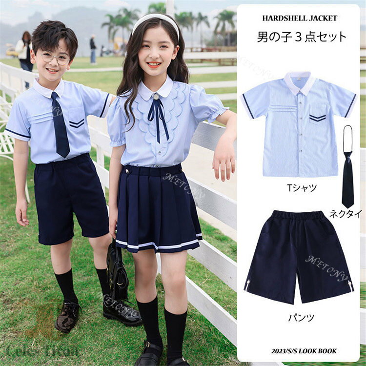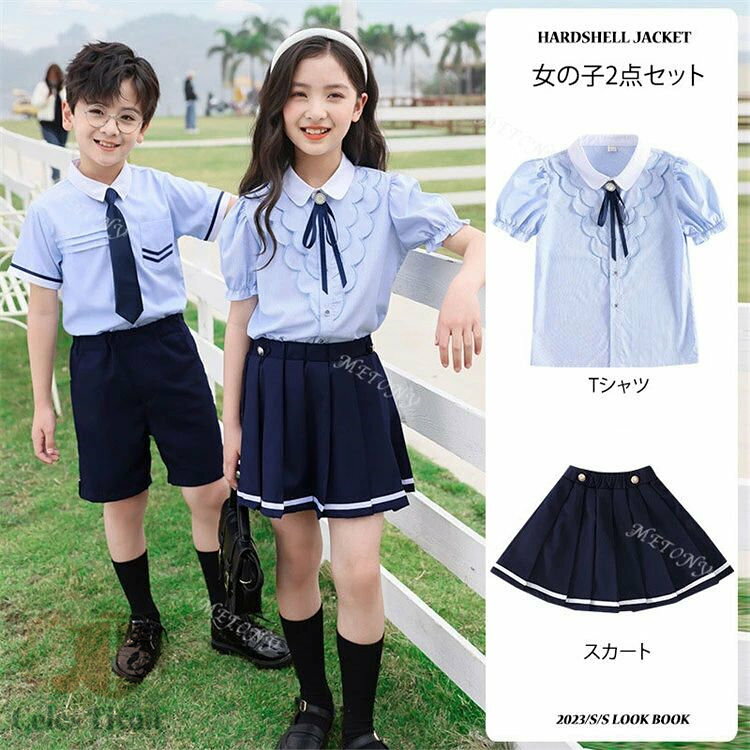 商品名称:制服 カラー:女の子 男の子 セット内容:女の子:シャツ+スカート 男の子:シャツ+パンツ サイズ:90-160cm 材質:綿 生産国:中国