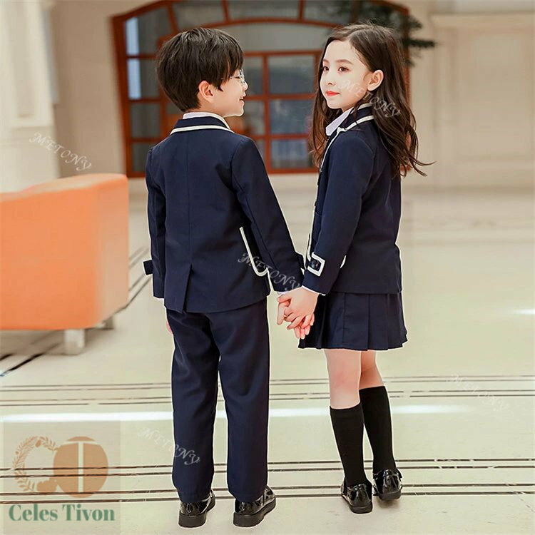 商品名称:制服 カラー:女の子 男の子 セット内容: 女の子:ジャケット+シャツ+スカート+リボン 男の子:ジャケット+シャツ+パンツ+ネクタイ サイズ:90-160cm 材質:ポリエステル 生産国:中国