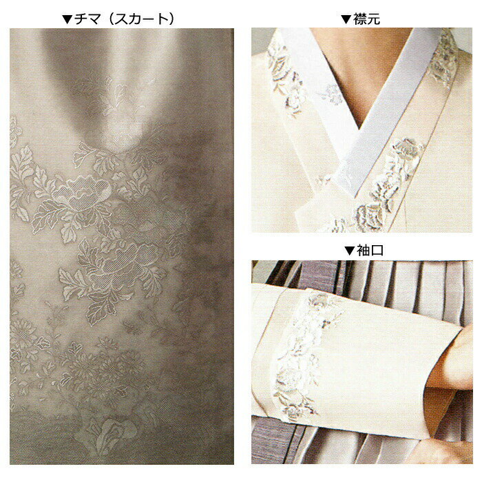 ・手作業で仕上げる袖先の刺繍デザイン、色、チマのポイント等はご注文時若干異なる場合がございます。