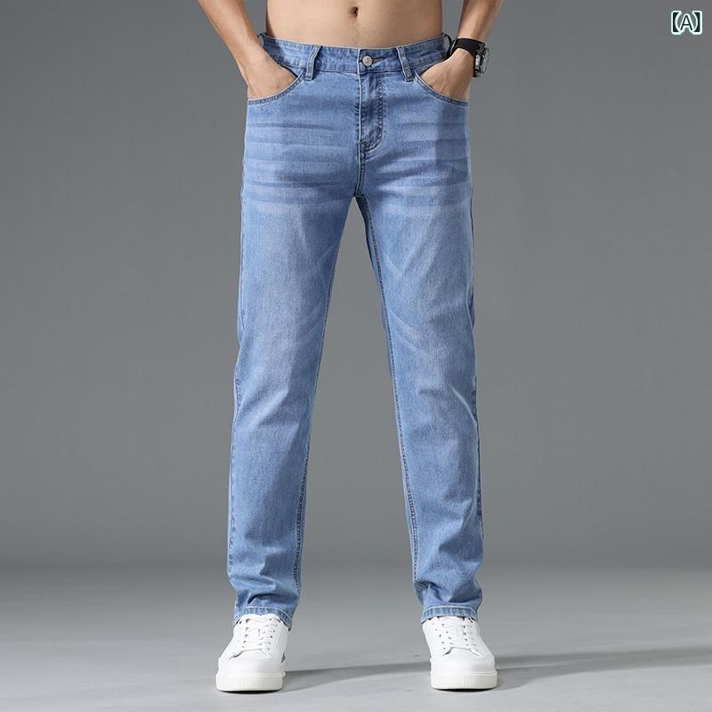 デニム メンズ デニムパンツ ジーンズ ストレート 薄手 ウォッシュ加工 カジュアル ロングパンツ ジーパン 男性用 ブルー ライトブルー インディゴ・商品カテゴリ: デニムパンツ・スタイル: カジュアル・対象年齢: 成人・対象: メンズ・サイズ: 28, 29, 30, 31, 32, 33, 34, 36・色: ブルー, ライトブルー, ダークブルー・パンツ丈: フルレングス・股上: 普通・フィット: レギュラー・素材: デニム, 綿・季節: 夏・特徴: ウォッシュ加工・開閉: ジッパー