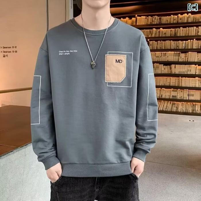 Tシャツ メンズ 男性用 春秋 薄手 カジュアル トップス 長袖 プルオーバー ラウンドネック スウェット トレーナー ブラック 黒 ホワイト 白 グレー