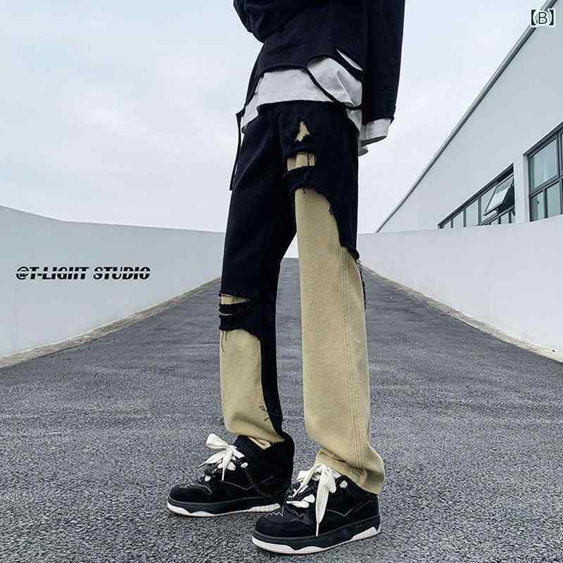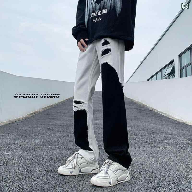 ジーンズ メンズ 男性用 デニムパンツ ゆったり ルーズフィット ストリート 切り替え ウォッシュ加工 ブラック 黒 ホワイト 白・スタイル: ストリート・タイプ: ベーシック・対象: 10代-20代・パンツ型: ルーズ・加工: ウォッシュ.ダメージ加工・パンツ丈: フルレングス・股上: 普通・フロント: ボタンフライ・・素材: デニム・メイン素材: 綿85%・利用シーン: デイリー・デザイン: カラーブロック・伸縮性: ややあり・裾: ストレート・色: ホワイト.ブラック.レザー調ひも付き(薄手)・サイズ: S.M.L.XL.2XL.3XL・対象: メンズ・カテゴリ: ジーンズ