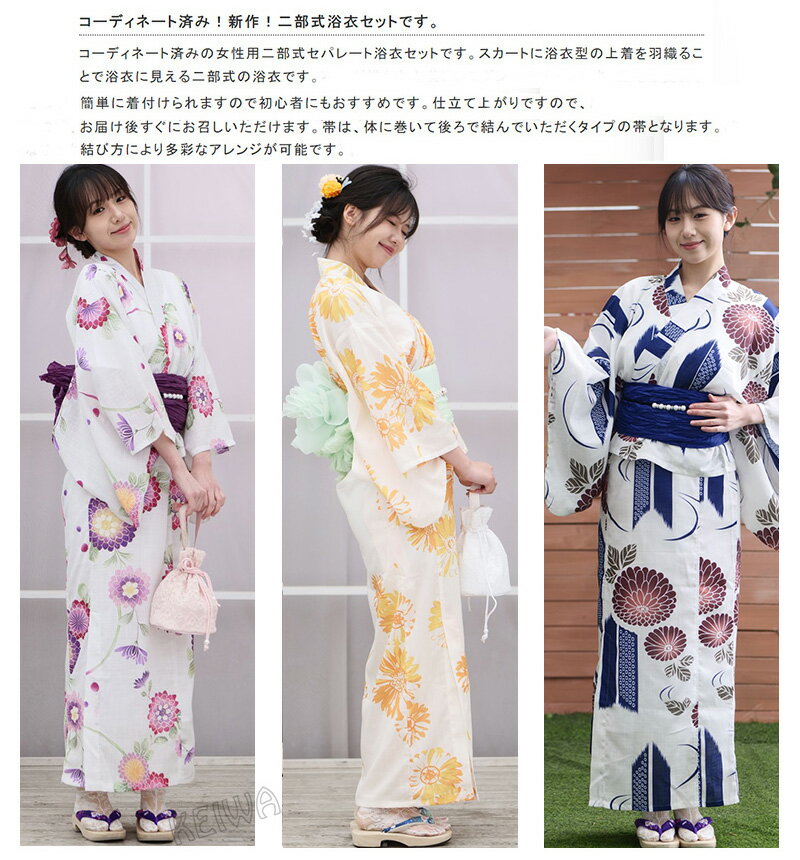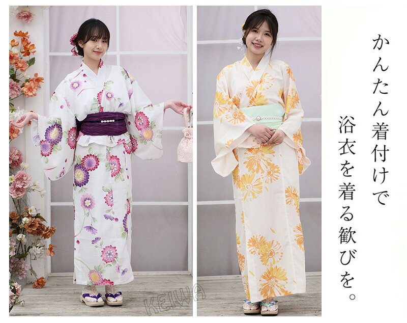 ※帯飾り・髪飾り・下駄などの小物は付属しておりません 商品説明 一人で簡単に着られる二部式浴衣。