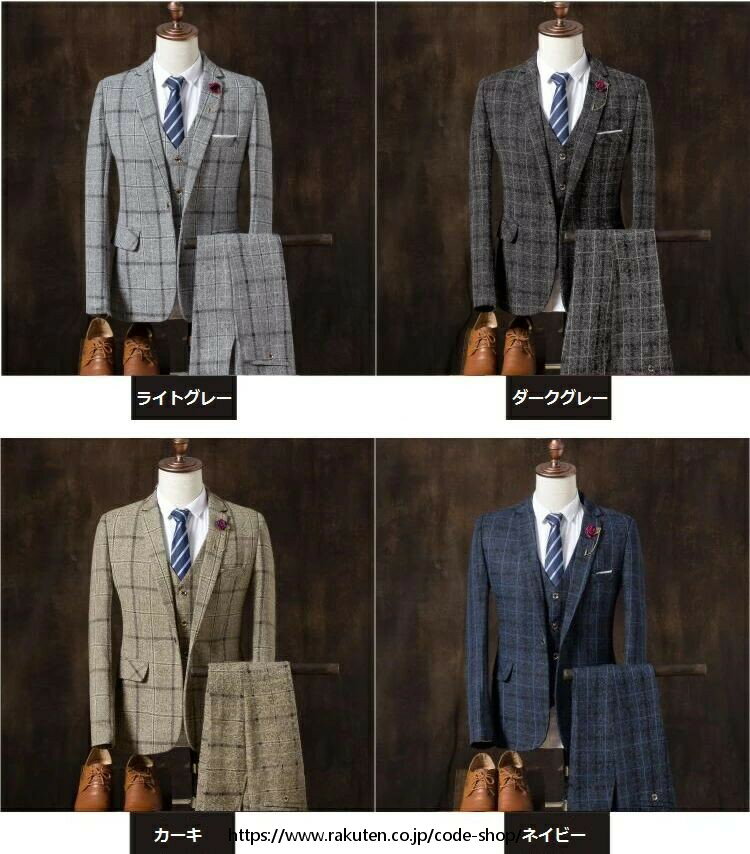 ★素材:ポリエステル ★生産国:中国 ★セット内容:ジャケット+ベスト+パンツ 伸縮性:なし 生地厚さ:普通 柔らかさ:普通 透け感:なし 付属品:なし ★カラー:カーキ ネイビー ライトグレー ダークグレー