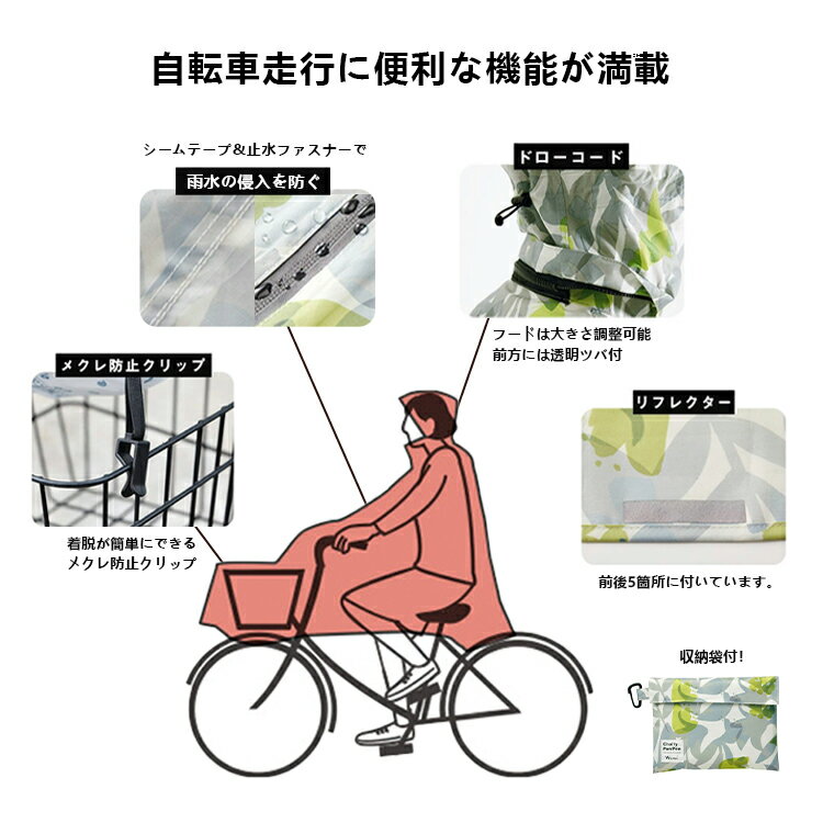 生産国 中国製 特徴 フードが首の動きに合わせて左右に動く特殊仕様 安全仕様で視界を遮らない 首元はマジックテープでしっかりとめて脱げにくく雨風も入りにくい作り 雨が侵入しにくい止水ファスナー 自転車に装着できる収納袋付 強い雨風から荷物を守る 前後5ヶ所にリフレクター付 サイドにカラビナがついている収納袋付