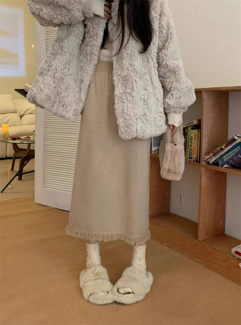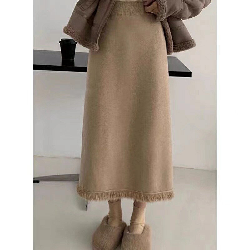 ニット スカート秋 冬 カシミアタッチ やわらか 大人 女子 フレンジ付き スカート ウエストゴム 縦長効果 ロングスカート 大人 ニット素材 可愛い カジュアル 大人 お洒落 ボトムス レディース 品番:gelitai33 カラー: グレー キャメル ベージュ コーヒー色 ブラック サイズ:F 着丈80cm ウエスト:66cm ヒップ80cm 素材;アクリル