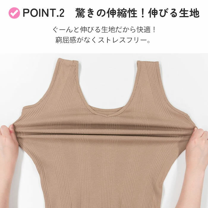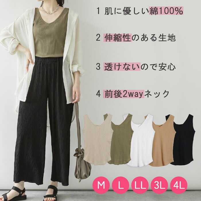 ※モデル身長:160cm素材コットン100%サイズ[Mサイズ]着丈:60cm、肩幅:31cm、身幅:37cm、裾幅:36cm、袖ぐり:18cm [Lサイズ]着丈:62cm、肩幅:32cm、身幅:40cm、裾幅:39cm、袖ぐり:19cm [LLサイズ]着丈:64cm、肩幅:33cm、身幅:43cm、裾幅:42cm、袖ぐり:20cm [3Lサイズ]着丈:66cm、肩幅:34.5cm、身幅:46cm、裾幅:45cm、袖ぐり:21cm [4Lサイズ]着丈:68cm、肩幅:37cm、身幅:50cm、裾幅:49cm、袖ぐり:22.5cmカラー01.ホワイト・02.ブラック・03.モカ・04.ベージュ・05.カーキメール便配送メール便可商品説明前後で着られる2WAYランダムリブタンクトップ。