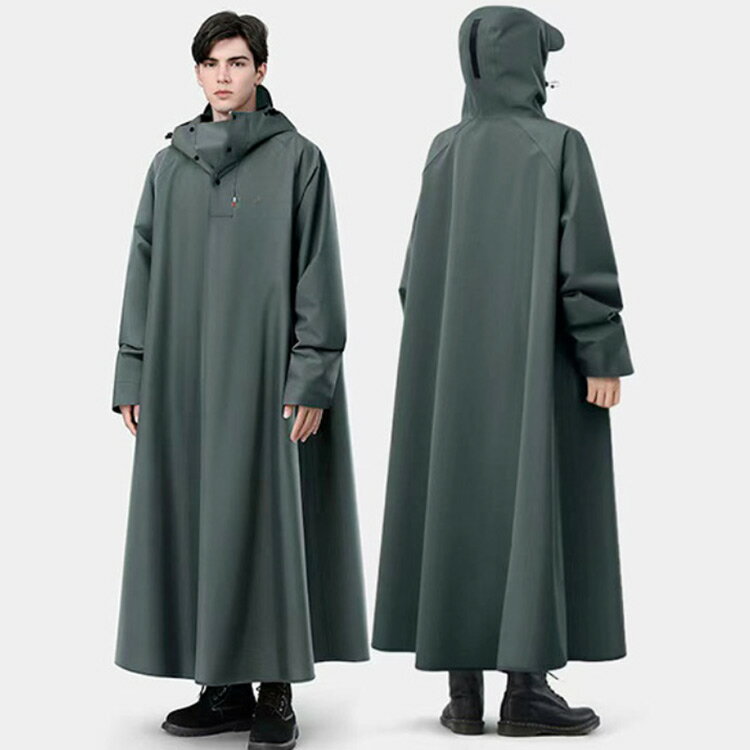 膝下までカバーするロング丈、体がしっかり覆われ、レインブーツを履けば足元まで濡れない、全身を雨から守ることができます。
