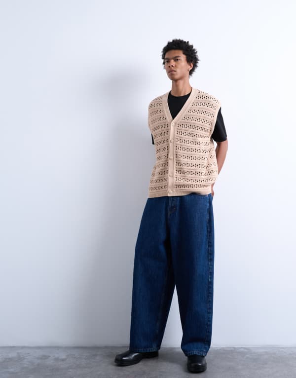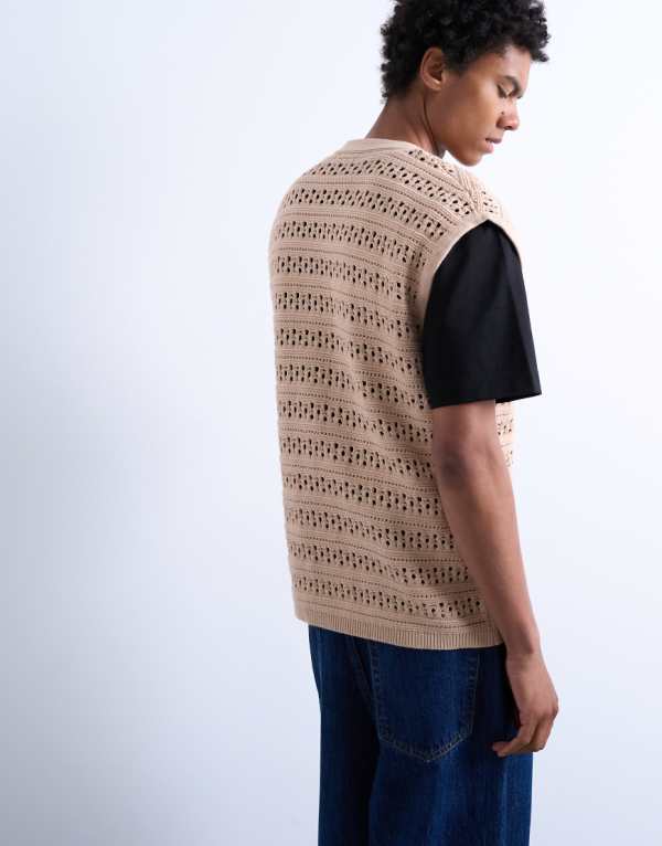 商品説明 Topman relaxed crochet button through vest in stone