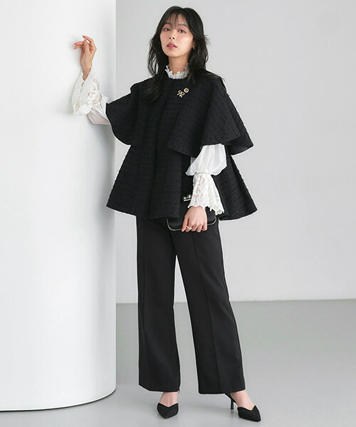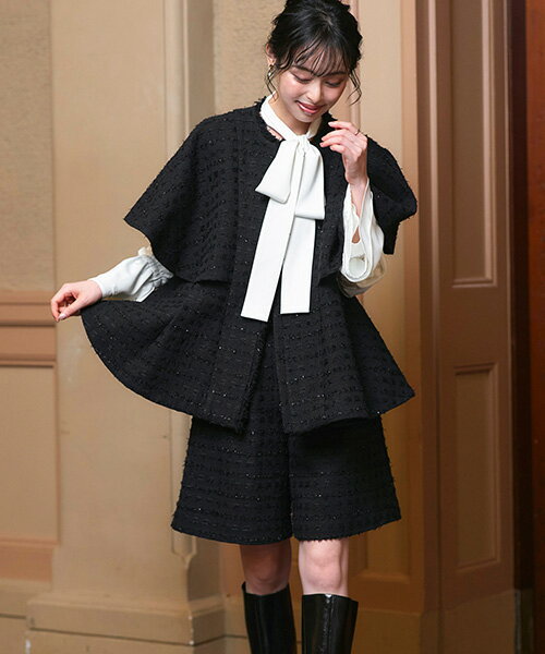【選べるパンツ】の2点セット ちょっと「可愛い」が効く、気分がアガるおしゃれセットアップ 羽織るだけでサマになる、上品な印象のツイードケープジャケット。