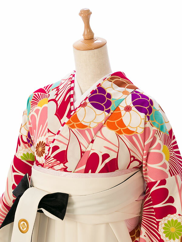 ■色/柄 着物:ピンク×赤地 菊に鶴 袴:クリーム地 椿丸紋刺繍