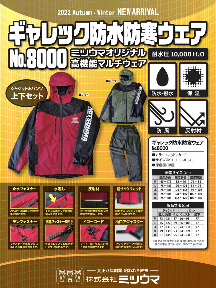 ■素材: 表地 ポリエステル100% 中綿 ポリエステル100% 裏地 ポリエステル100% 耐水圧10,000mmミツウマオリジナルの高機能マルチウエアです。