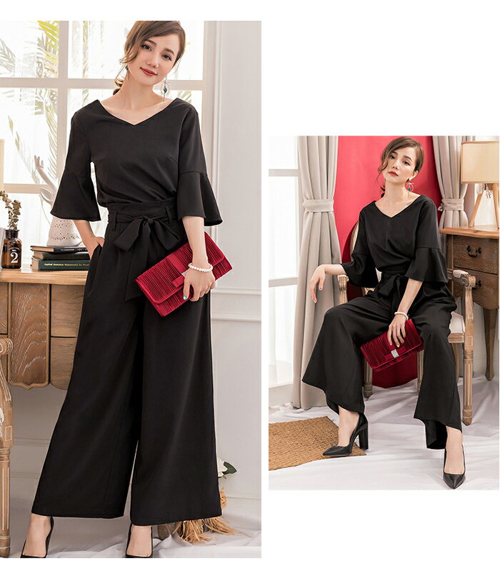 Information 商品名 レディース パーティー セットアップ パンツドレス フレア袖 上下セット リボンベルト付き 素材 ポリエステル100%