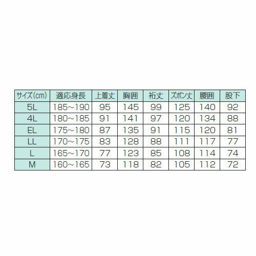 ■特長・ズボンのみ販売可能商品サイズ(cm)適応身長上着丈胸囲裄丈ズボン丈腰囲股下5L185〜1909514599125140924L180〜185911419712013488EL175〜180871359111512081LL170〜175831288811111777L165〜170771238510811474M160〜165731188210511272