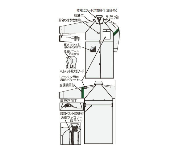 ■特長・警備員向けレインコート・交通腕章、肩章、透明ポケット(左胸・左腕)付・ヘルメット対応フード・汗による蒸れ解消のための背面ベンチレーション・サイズと前合わせが女性向け仕様サイズ(cm)適応身長総丈胸囲裄丈裾囲4L170〜17512512688127EL165〜17012012186122LL160〜16511511684117L155〜16011011282113M150〜15510510780108