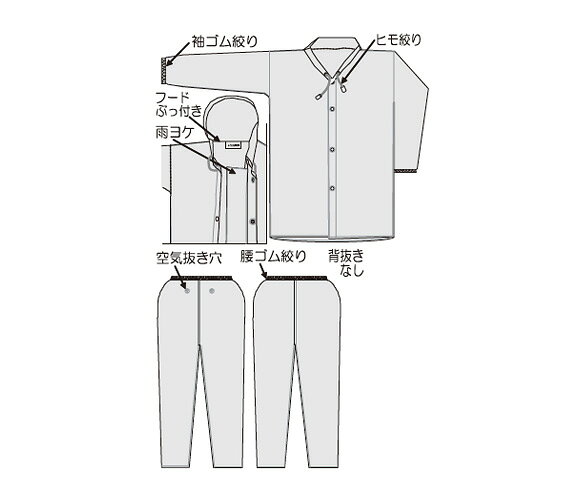 ■仕様・素材:PVC 100%・色:クリア・サイズ:LLサイズ(cm)適応身長上着丈胸囲裄丈ズボン丈腰囲股下EL175〜180861309111211281LL170〜175801188310511074L165〜170751188110111070M160〜16570116799711066