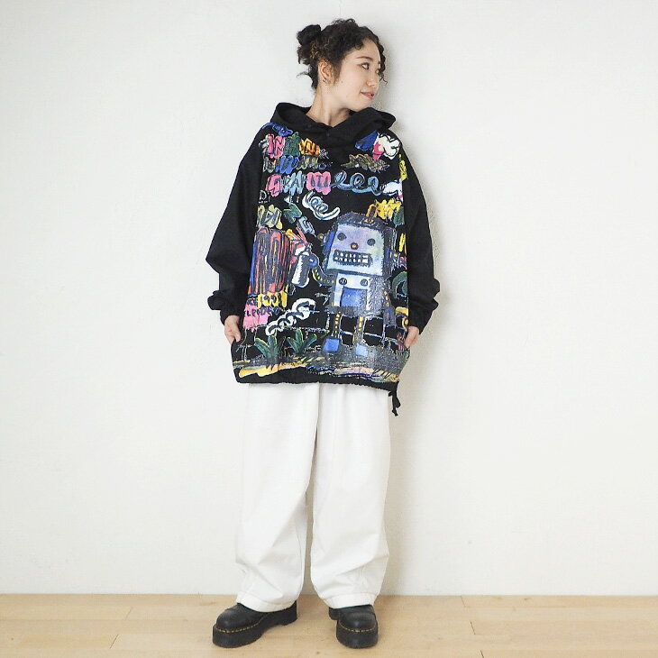送料無料 落書き風ロボフルプリント プルオーバー レディース トップス 長袖 フード付き パーカー カジュアル カラフル プリント 総柄 ゆったり 大きい オーバーサイズ 古着系 送料無料 落書き風のロボットが可愛い!プルオーバー。