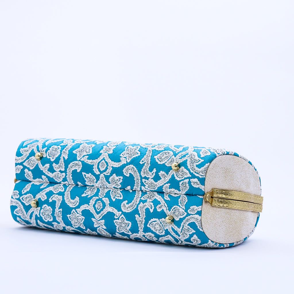 「優美なブルーの唐草文様」西陣織正絹帯地でお誂えのセレモニーバッグ。