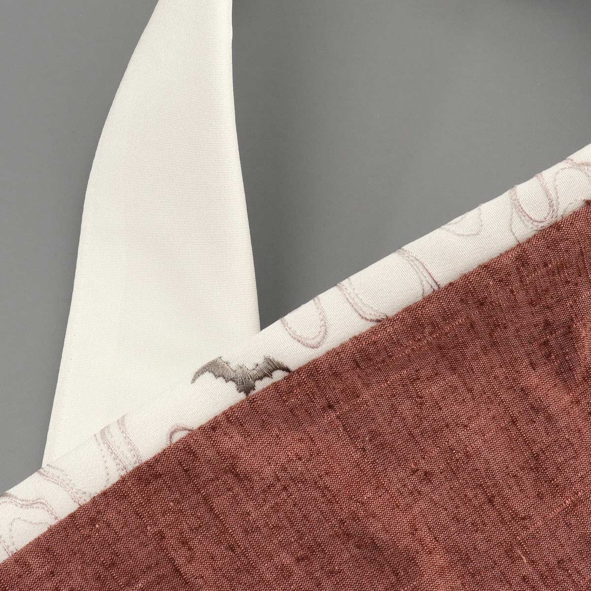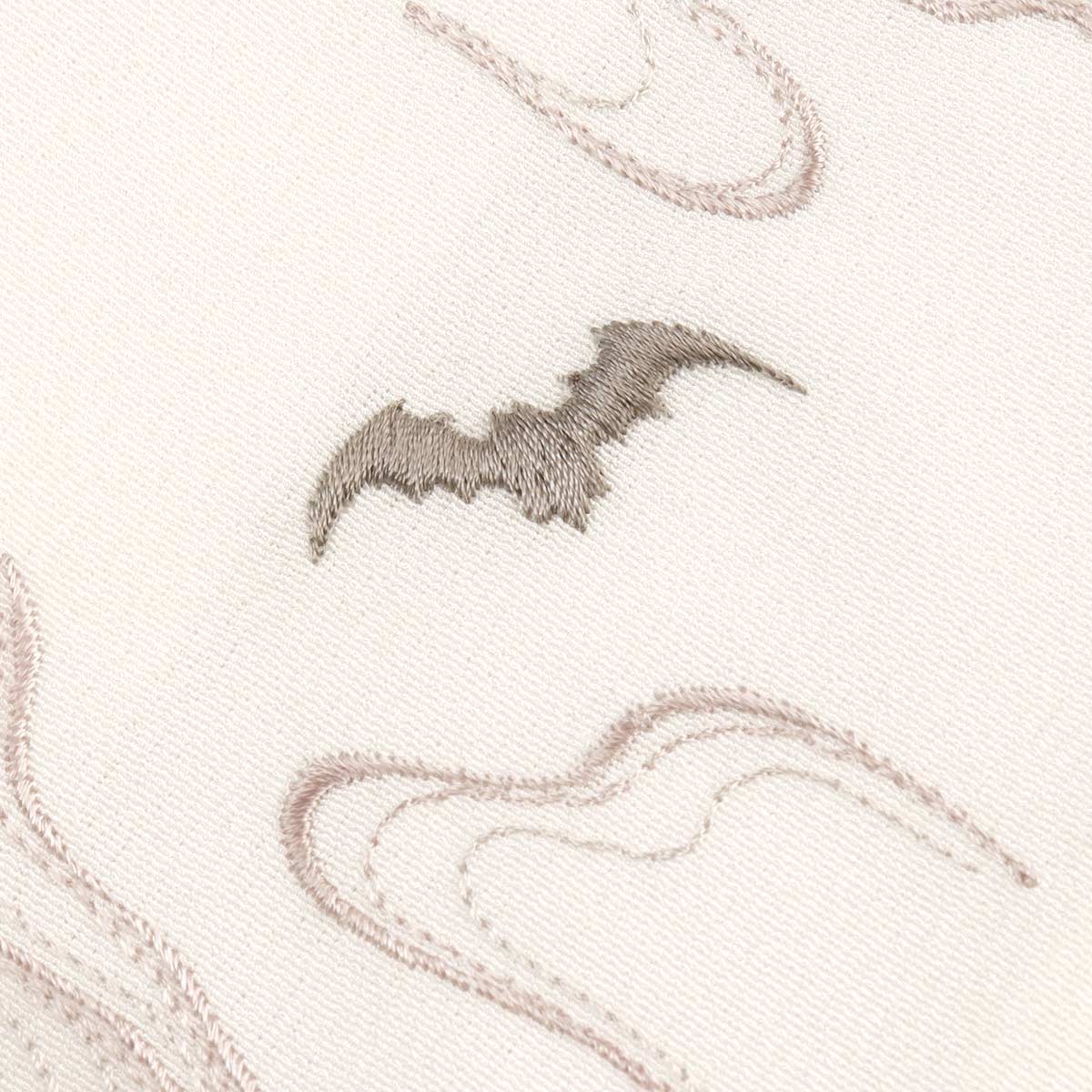 白色の半衿に、蝙蝠の柄を刺繍で表現しました。