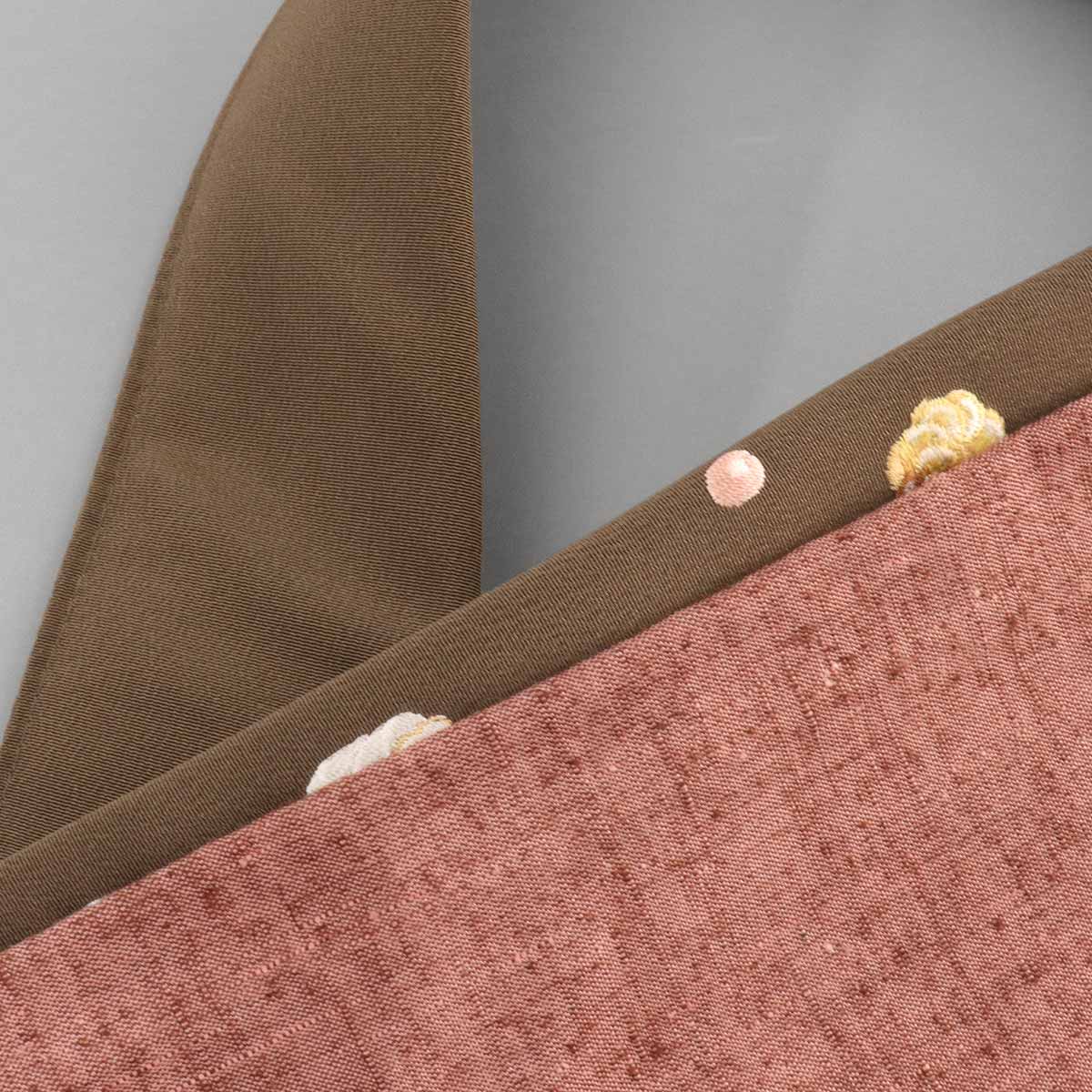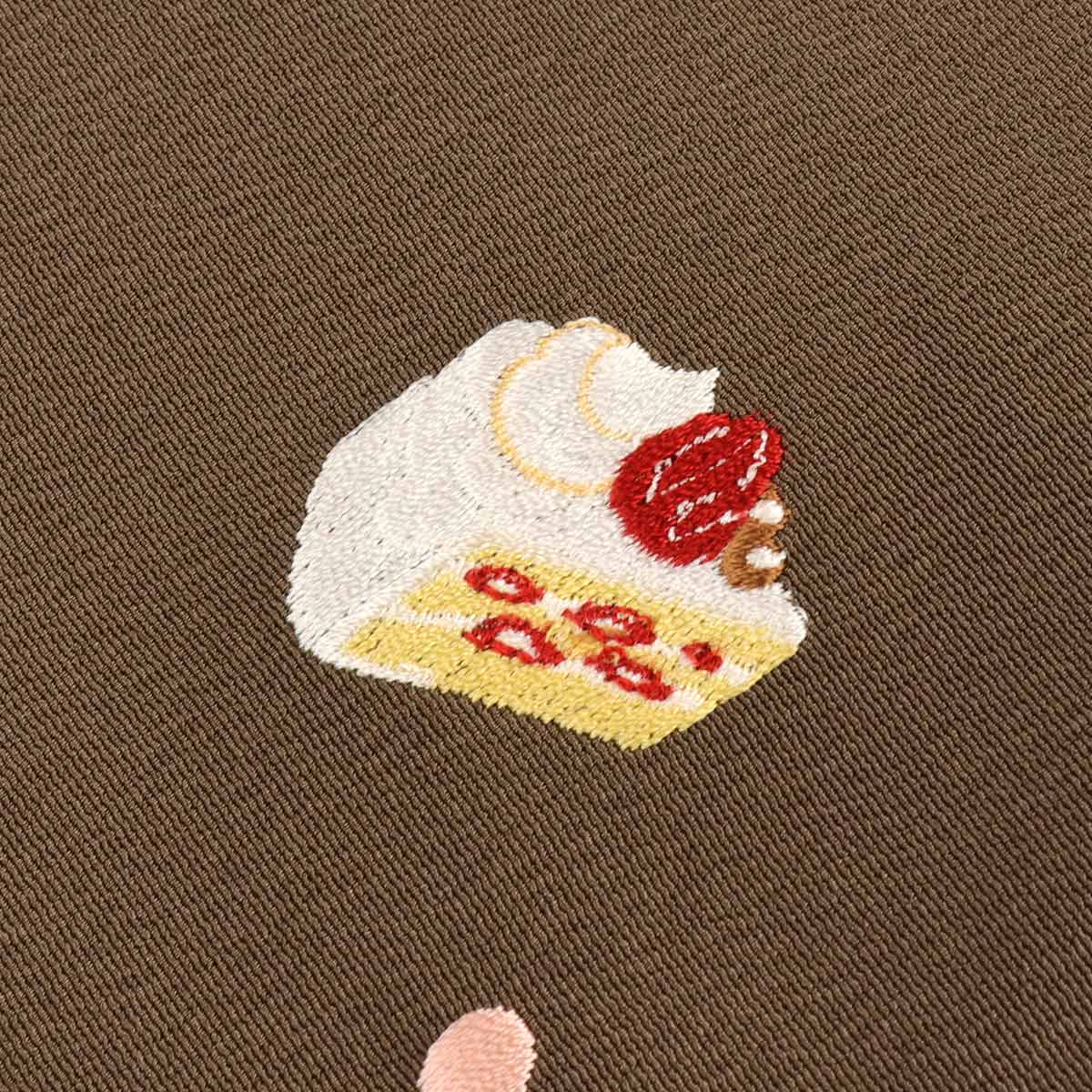 ブラウンの半衿に、ケーキ、ドーナツ、マカロンなどのスイーツ柄を刺繍で表現しました。