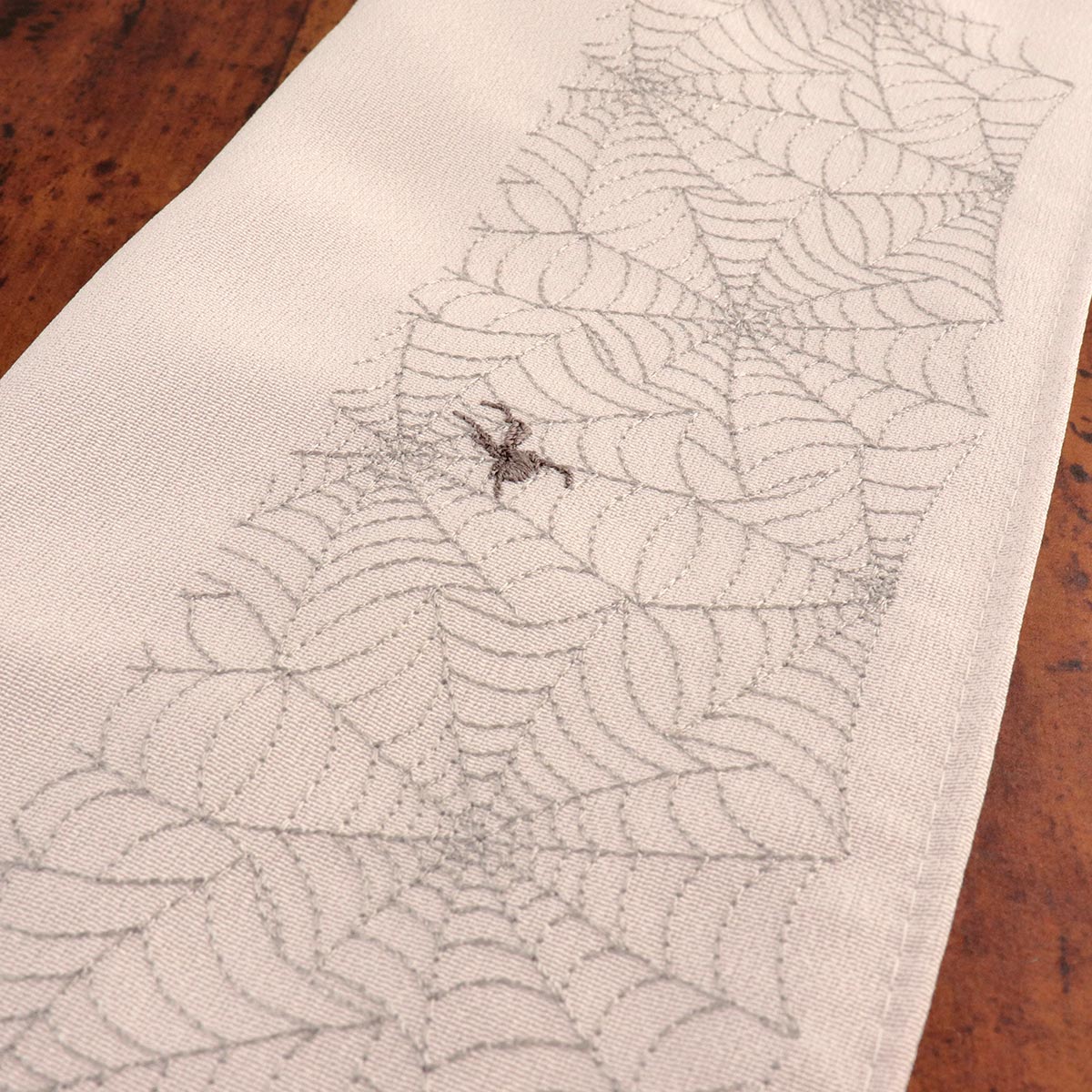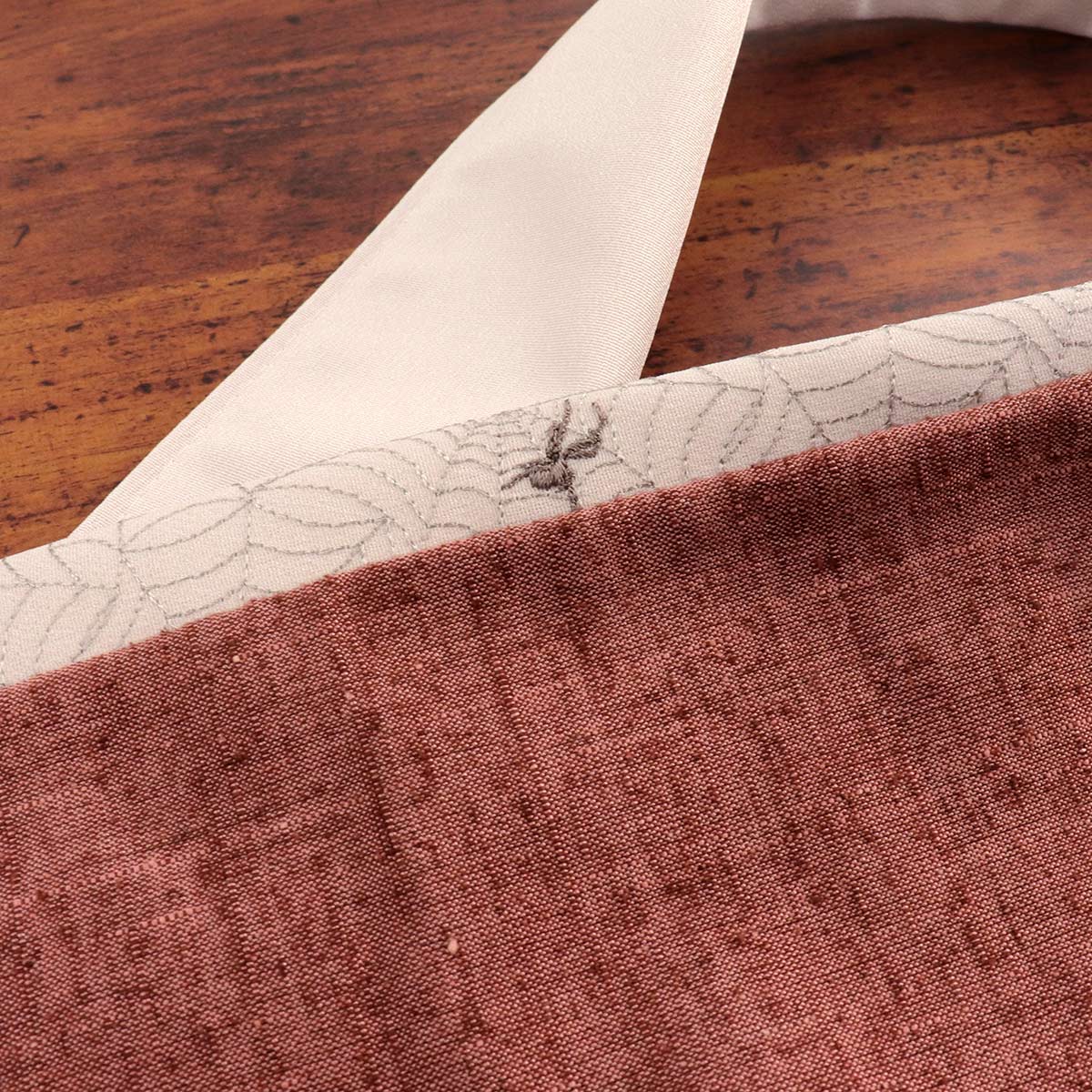 ショップトップはこちら き楽っくはこちら 替え衿はこちら 替え袖はこちらファスナーを閉じればそれだけで半衿付けは終了!き楽っく専用替え衿 ピンクグレー色の半衿にグレーの糸で蜘蛛の巣、ダークブラウン色の糸で蜘蛛が刺繍されています。