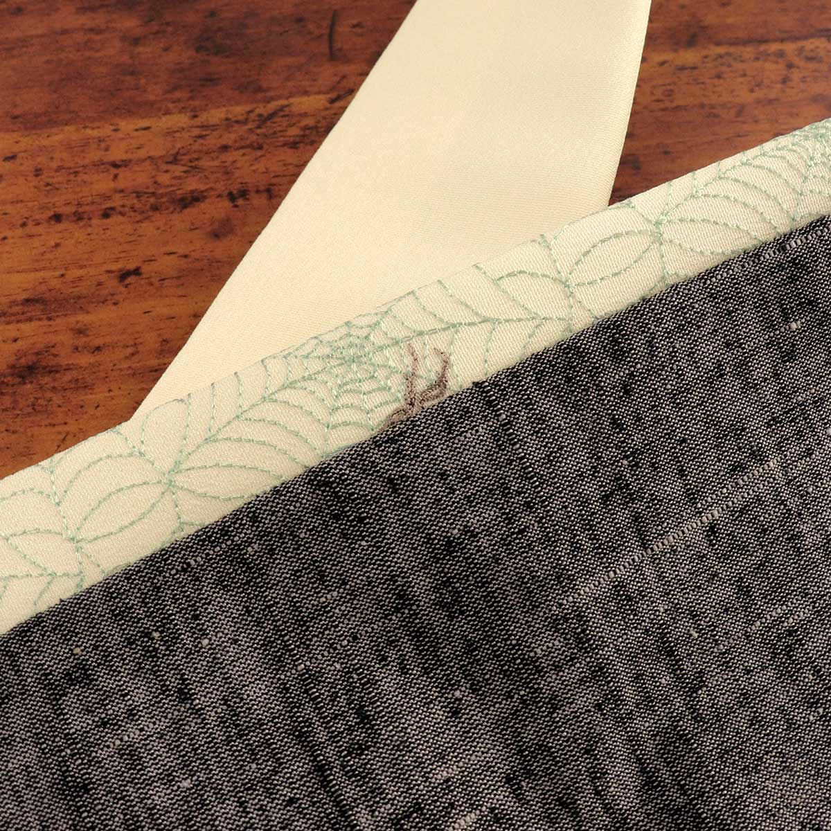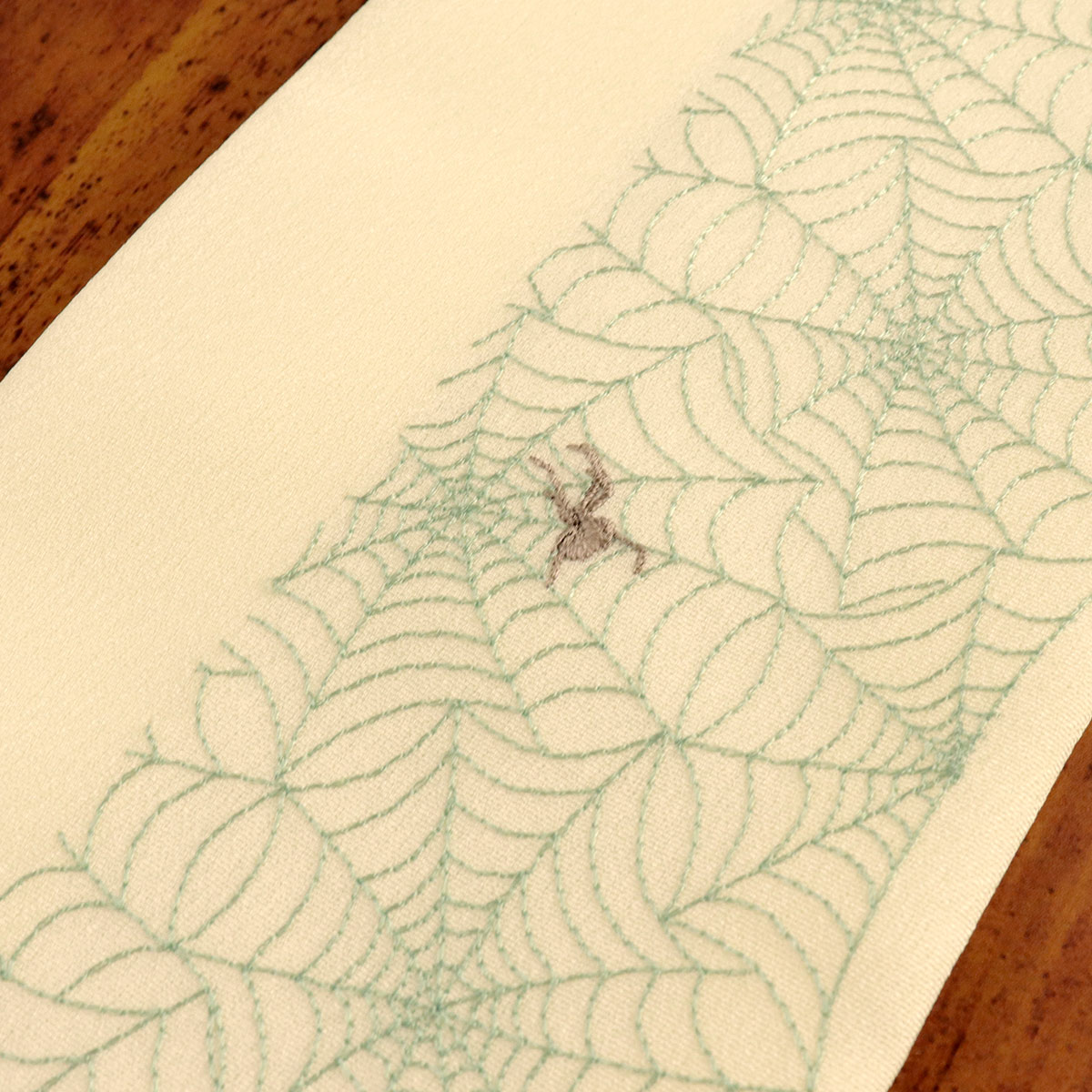 薄黄色地の半衿にグリーンの糸で蜘蛛の巣、ブラウンの糸で蜘蛛が刺繍されています。