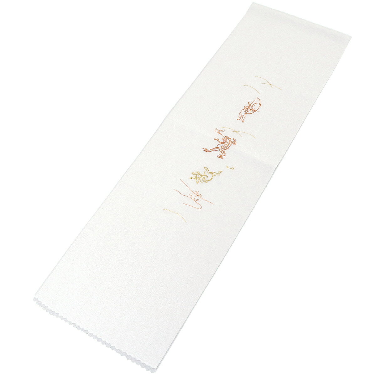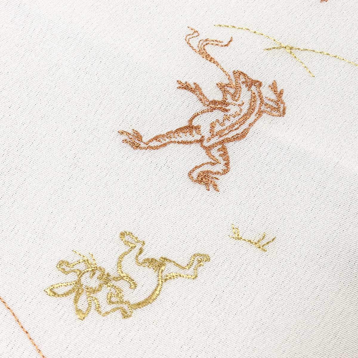 柿渋色と木蘭色で鳥獣戯画が刺繍されています。