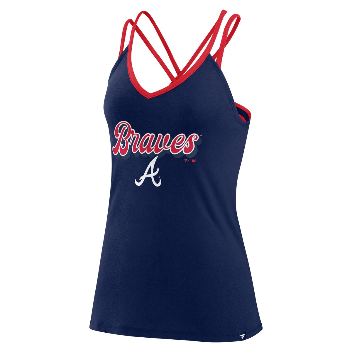 During the heat of baseball season, keep cool in this Atlanta Braves Go For It Strappy tank top. This fashionable design by Fanatics features a flattering V-neckline and contrasting straps that accentuate the team graphics on the chest. Blended material adds to the comfortable feel of this Atlanta Braves top.Spaghetti straps cross in backV-neckScreen print graphicsSleevelessMachine wash, tumble dry lowImportedBrand: FanaticsMaterial: 50% Cotton/50% PolyesterOfficially licensedThis item is non-returnable