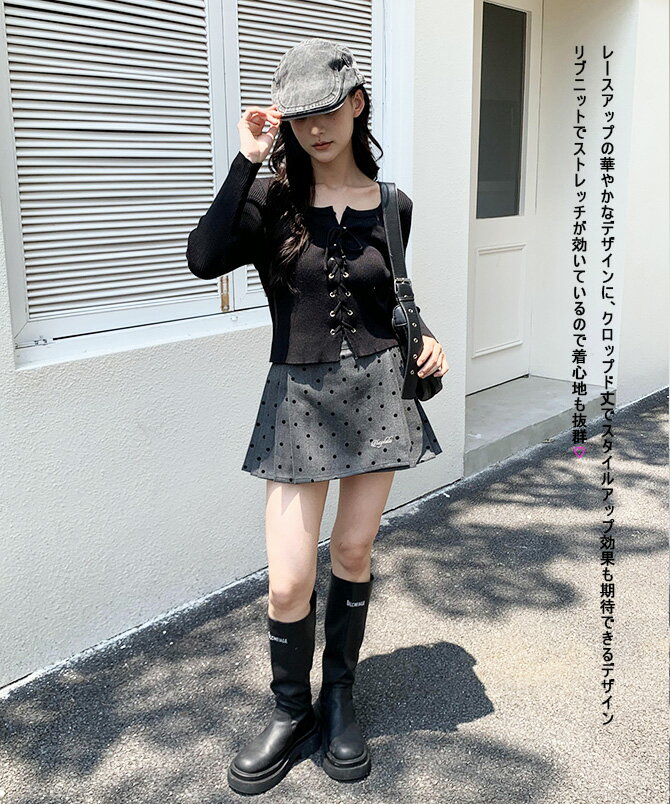 ITEM INFOMATION 大人気のレースアップデザインのリブニットの長袖トップス レースアップの華やかなデザインに、クロップド丈でスタイルアップ効果も期待できるデザイン。