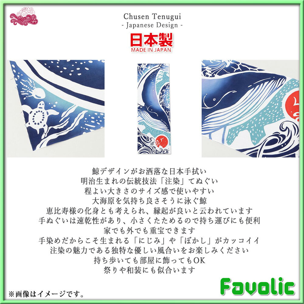 商品情報商品説明Chusen Tenugui- Japanese Design -Made in Japan鯨デザインがお洒落な日本手拭い明治生まれの伝統技法「注染」てぬぐい程よい大きさのサイズ感で使いやすい大海原を気持ち良さそうに泳ぐ鯨恵比寿様の化身とも考えられ、縁起が良いと云われています手ぬぐいは速乾性があり、小さくたためるので持ち運びにも便利家でも外でも重宝できます◆明治生まれの伝統技法「注染(ちゅうせん)」てぬぐい◆受け継がれた伝統,変わらない技法,時代を経て,進化するデザイン手染めだからこそ生まれる「にじみ」や「ぼかし」がカッコイイ注染の魅力である独特な優しい風合いをお楽しみください持ち歩いても部屋に飾ってもOK細部までこだわりのある日本製派手すぎない大人可愛いカラーフェイスタオルにもハンドタオル、汗拭きタオル祭りや和装にも似合います和風 和モダン 昭和レトロ 和装明治 大正 昭和 浴衣 花見 夏祭り 秋祭り 京都 浅草素材綿100%(日本製)