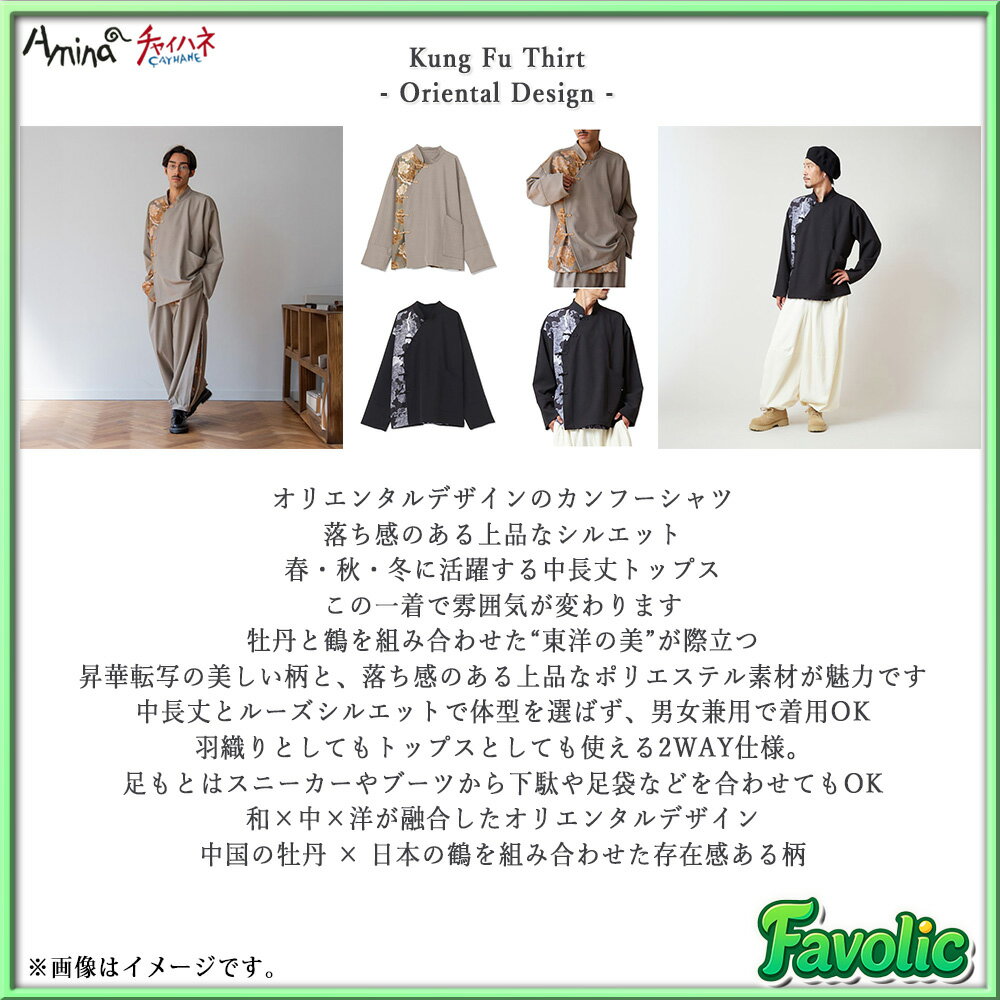 関連キーワード和装 羽織 和モダン 和洋ミックス 浴衣 アウター 和柄トップス 男女兼用 和装 きれいめ和装 エスニック チャイナ風 チャイハネ オリエンタル アジアンファッション 東洋デザイン カーディガン 羽織り カンフーシャツ メンズトップス 春服 秋服 冬服 軽アウター 重ね着 ルーズシルエットスラミア カンフーシャツ メンズ トップス 牡丹 鶴柄 花柄 薄手 日本 春秋冬 和風 オリエンタル エスニック レディース amina チャイハネ Favolic COT-5314 オリエンタルデザインのカンフーシャツ落ち感のある上品なシルエット春・秋・冬に活躍する中長丈トップスこの一着で雰囲気が変わります オリエンタルデザインのカンフーシャツ オリエンタルデザインのカンフーシャツ落ち感のある上品なシルエット春・秋・冬に活躍する中長丈トップスこの一着で雰囲気が変わります牡丹と鶴を組み合わせた“東洋の美”が際立つ昇華転写の美しい柄と、落ち感のある上品なポリエステル素材が魅力です。