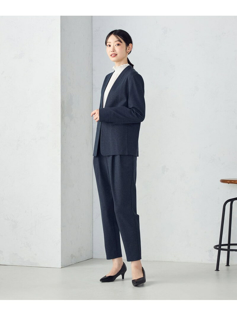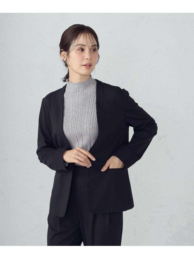 【ウォッシャブル】メランジジャージ&ナイロンレーヨンポンチ ノーカラージャケット《デザイン》布帛見えするカットソー素材を活かした、V開きノーカラージャケットです。