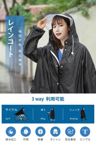 男女兼用大きめサイズ街歩きはもちろん、自転車、バイク、原付き運転にも対応可能なレインコートです。