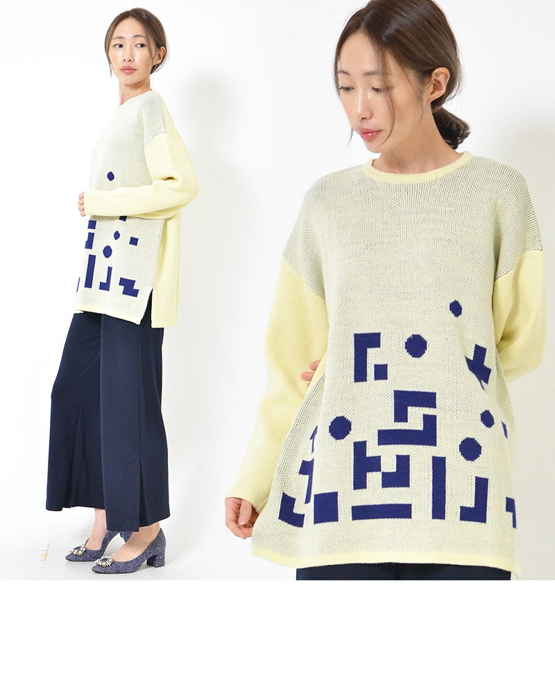 もちもち幾何学柄 ニットチュニック幾何学模様が印象的なデザイン前身頃に特徴的な幾何学模様の柄をジャカード編で施した、ラウンドネックのニットプルオーバーです。
