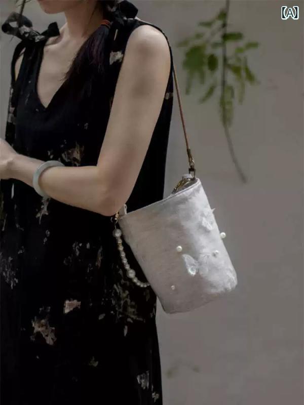 スタイル: ナチュラル デザイン: ステッチ入り 外ポケット: 内ポケット付き バッグの硬さ: 柔らかめ タイプ: 巾着型 裏地: ポリエステル ショルダーストラップ: シングルストラップ 開閉: マグネット式 シーン: デイリー 形状: 巾着型 サイズ: 小さめ 素材: キャンバス 内側仕様: ファスナーポケット付き 柄: 蝶柄 カラー: ホワイト(ビーズチェーン付き)