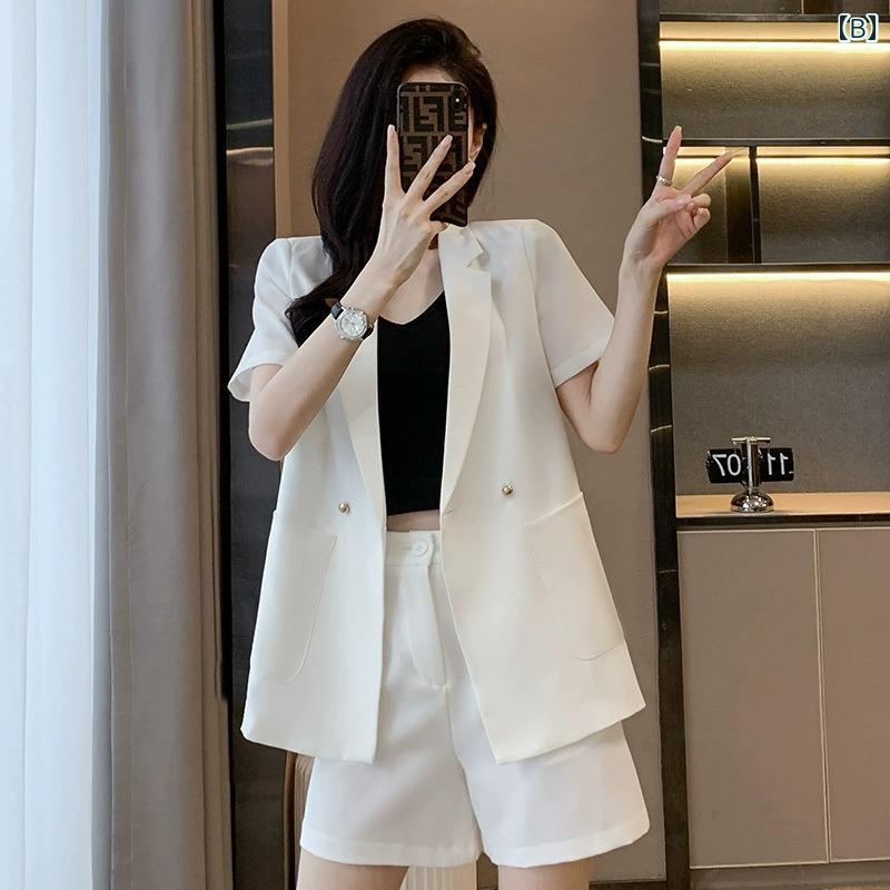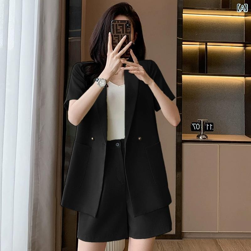 サイズ: S.M.L.XL.2XL.3XL.4XL 素材: ポリエステル 柄: 無地 スタイル: オフィス向け 襟型: テーラードカラー 前立て: ダブルボタン カラー展開: 黒.白.緑.杏色(セットアップ.単品.インナー付きのバリエーションあり) 袖型: レギュラー 袖丈: 半袖 着丈: レギュラー シルエット: ゆったり デザイン: ポケット付き