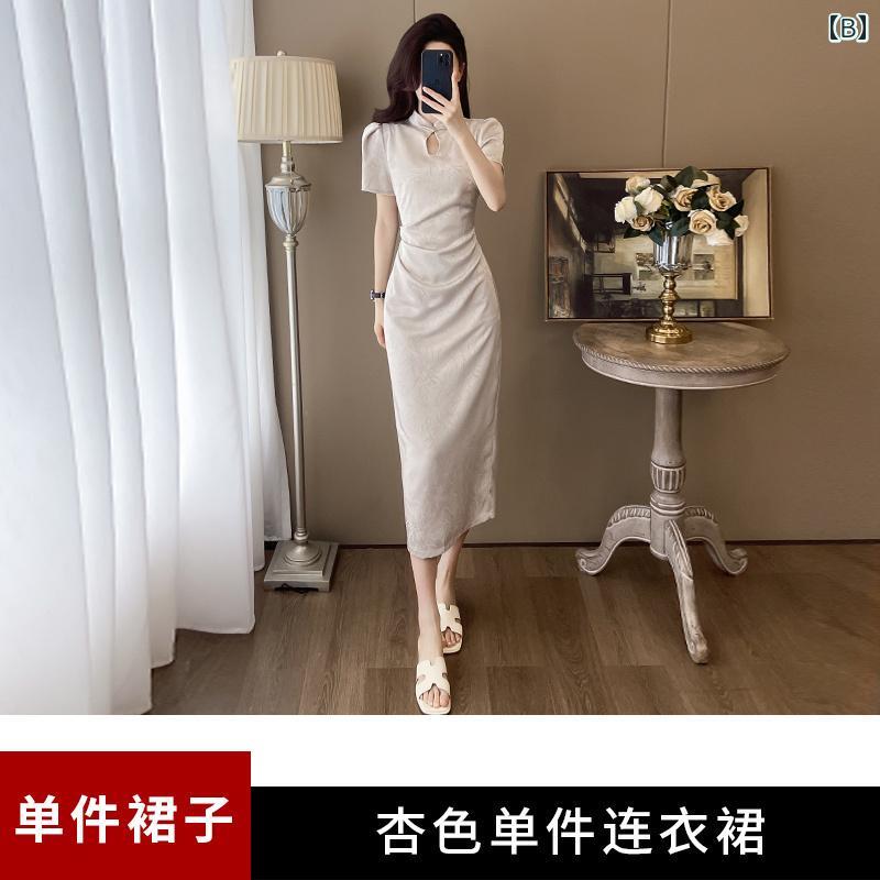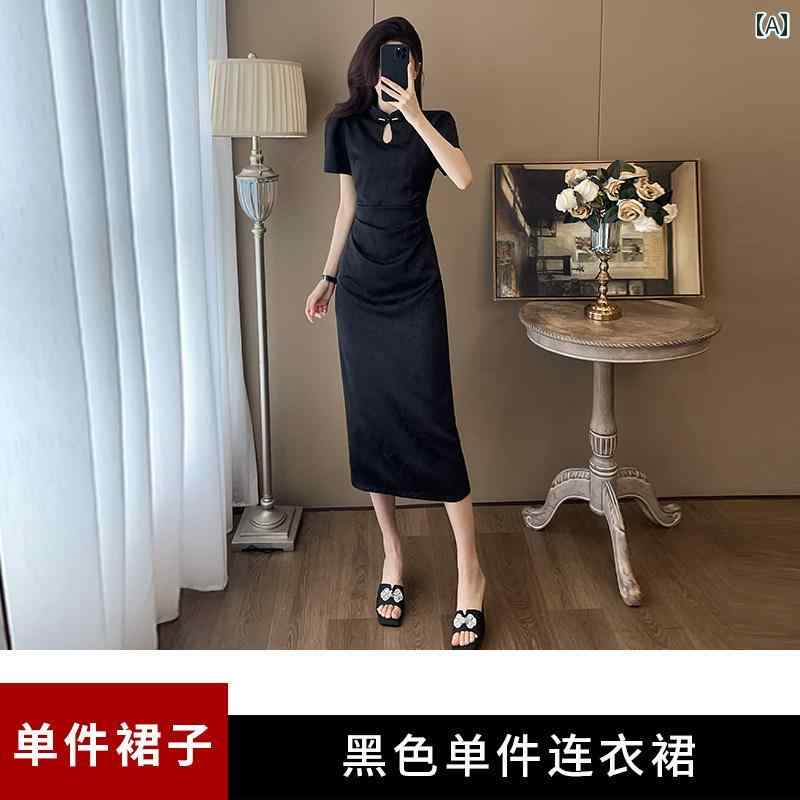 風 要素・工芸: 無地 ウエストタイプ: ウエスト絞り 素材: ポリエステル 袖タイプ: 半袖 スカートタイプ: タイトスカート 袖丈: ノースリーブ スカート丈: ロング丈 襟型: チャイナカラー シルエット: Hライン 柄: 無地 開閉方式: ファスナー サイズ展開: S.M.L.XL.2XL.3XL カラー: ブラック.アプリコット