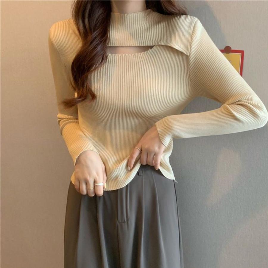 ※ニット素材の為、伸縮具合によっては編みに隙間を感じる場合があります生産国:中国レディース 胸開き ニットカットソー 長袖 おしゃれ ニットソー 着やせ プルオーバー 無地 オフィスカジュアル胸元の開きでほんのりな雰囲気を醸し出すニットトップスですプチハイネックが大人な感じになり、どんなコーデにも合わせやすいですボディに沿うフィット感で女っぷりUP、リブ生地特有のタテ線がはっきり見えることで細見えも狙えますフレアスカートやワイドパンツなどと合わせるとよりスタイルアップできるのでオススメです
