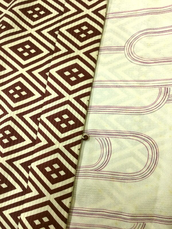 商品説明:白地に菱模様の陣羽織。 サイズ:肩幅約60、背着丈77.5、袖付48.5、前幅17、後幅29cm。 素材:正絹。 状態:ランク2。 肩山にシミ(写真6)、羽裏にもシミ(写真5)がございます。 TPO:普段着、部屋着。 仕立て:手縫い、ミシン。 簡易リメイクのため全体的な直しはしていません。 細部へこだわりのある方には向かない仕立てです。予めご了承ください。