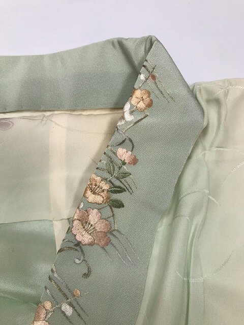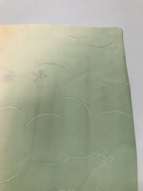 商品説明:小花に芝草の地紋のグリーンぼかしの染め成し袖は無双袖にて袷の扱い 刺繍半衿付き サイズ:裄64、身丈124、袖丈48、前幅259、後幅32cm 素材:正絹 状態:ランク3 クスミ有 TPO:普段着等 仕立て:手縫い バチ衿